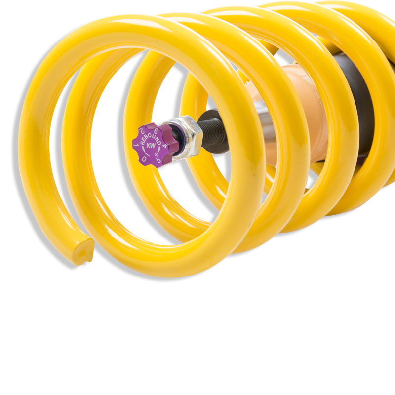 Cutting-edge motorsports technology for more performance on the road. Like every suspension product developed by KW automotive, the suspension manufacturer, and manufactured in Germany, the KW V3 Coilover suspension kit also provides a significant plus in safety reserves in road traffic. Thanks to the chassis with its high-quality dampers, springs, and elastomer spring elements, pitching and rolling movements during load changes such as evasive maneuvers, cornering, acceleration, and braking are significantly reduced. The braking distances are also shortened. Thanks to improved support and feedback, drivers not only feel safer but driving in everyday life becomes even safer. With compression and rebound stage damping, that can be set separately and independently of each other, the damper setup can be customized to your personal driving preferences or vehicle changes such as weight, tire characteristics, or altered vehicle rigidity. True performance optimization is only possible with this unique, patented system. For example, this allows the compression damping force to be increased and get more grip from the tires, to improve cornering behavior and reduce squat without simultaneously altering the rebound stage damping which is optimally matched to the spring rate, a scenario which results in reduced grip and the associated loss of performance. The KW V3 coilover kit is the ideal tool for performance-oriented drivers and experienced tuning enthusiasts who place a strong emphasis on the overall performance of their suspension. The Variant 3 features patented TVR-A and TVC-A technology that provides separately adjustable rebound and compression damping. The extensive adjustment range of the independently configurable rebound and compression make it easy to directly influence the steering behavior, directional stability, grip and handling characteristics for confident and repeatable results at the limit of driving dynamics.