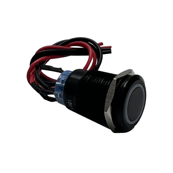 - 12V 19mm Momentary Function Pre-Wired Switch with White LED and Black Flush Mount Finish